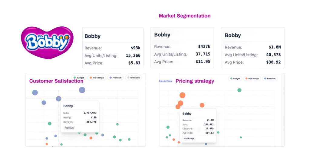 - Pricing & Discount Strategy Analysis: With an average price of $14.82, Bobby sits between Huggies and Gooby. Its discounts average around 18%, reflecting a steady promotional strategy that avoids overly aggressive cuts. This consistency supports its positioning as a reliable everyday option while preventing downward pressure on perceived value.