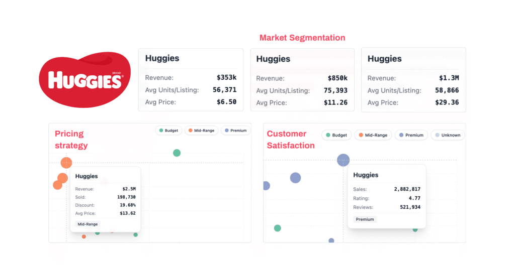 - Market Segmentation: Huggies is the only brand with meaningful presence across all price tiers—budget, mid-range, and premium. This broad segmentation allows the brand to capture multiple shopper segments, from price-sensitive parents to those prioritizing premium features. Its laddered portfolio reduces customer leakage by offering an upgrade or downgrade path within the same brand.